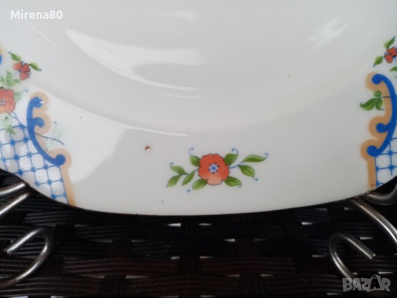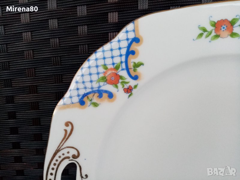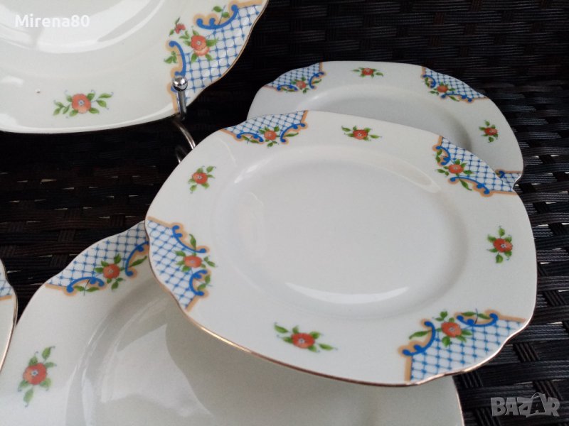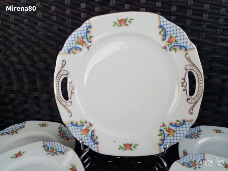Един впечатляващ сервиз на доста години (според маркировката произведен в периода 1922-1945 г.). Фабриката е създадена в далечната 1810 г. и е една от най-старите и реномирани от този период. С декор и дизайн, традиционни за чешкия порцелан от тези години. Стилизиран разцъфнал мак с позлата - ръчно рисувани ! Плато с дръжки (22/22 см) + 6 чинийки (16.5/16.5). В отлично порцеланово здраве - без чукнато, пукнато и т.н, с отлична глазура, малка фабрична черна точка на едната чинийка.