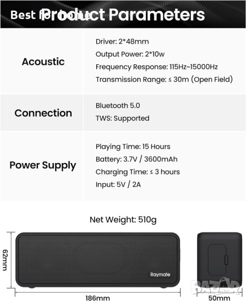 Bluetooth високоговорители Raymate, 20 W IPX7 водоустойчив високоговорител, безжичен Bluetooth-V5.0, HiFi стерео звук, 1000 минути време за възпроизвеждане, преносим високоговорител за открито