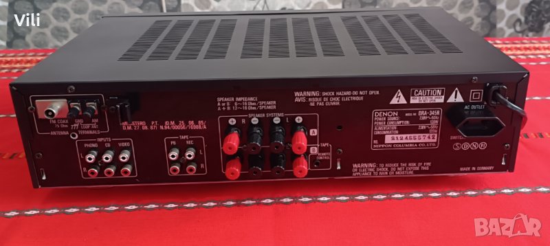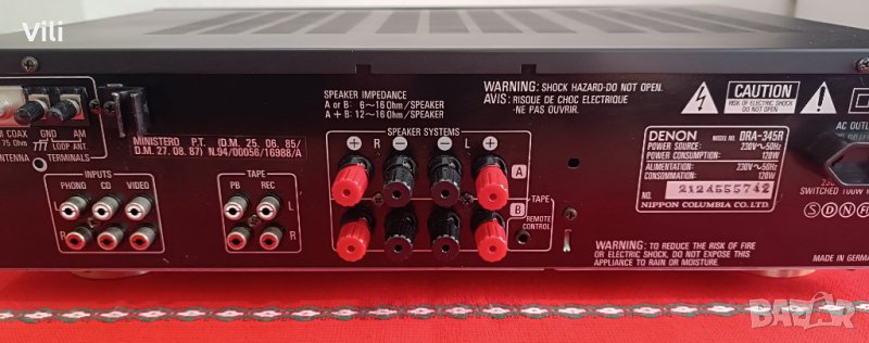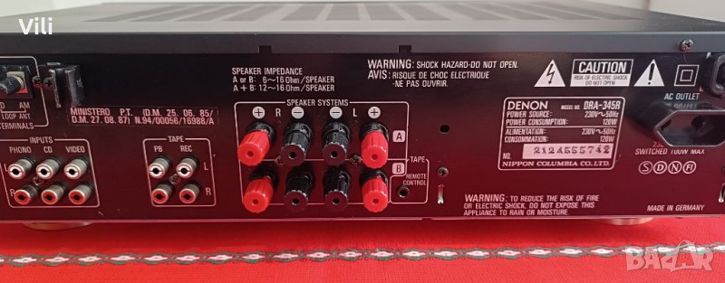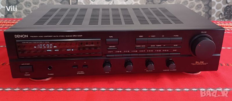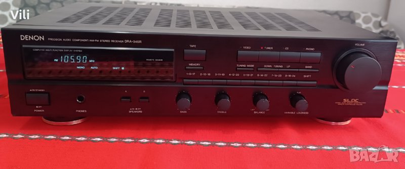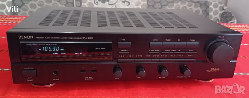 Транзисторен стерео ресивър Denon DRA-345R.Работи отлично.Цена:170 лева.GSM:0886740535.Има възможност за запаметяване на 16 станции,както и разполага с опция за дистанционно управление но оригиналното липсва. Изходна мощност:2 по 60 вата/6ohm и 2 по 50 вата/8ohm.Много добра селективност и чувствителност на тунера.Произведен в Германия.