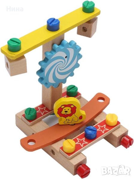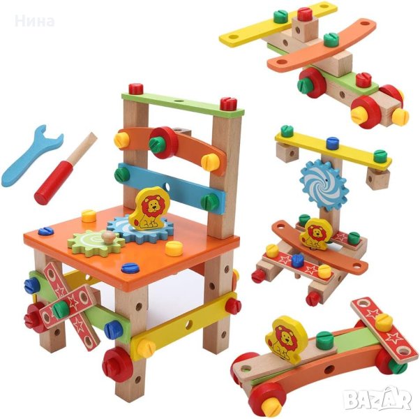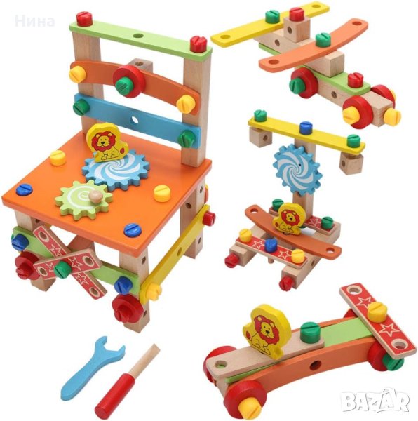 Дървен многокомпонентен строителен комплект за сглобяване на столче или други структури 🔩🔧🪑 Комплектът включва отвертка, гаечен ключ и монтажни части.
