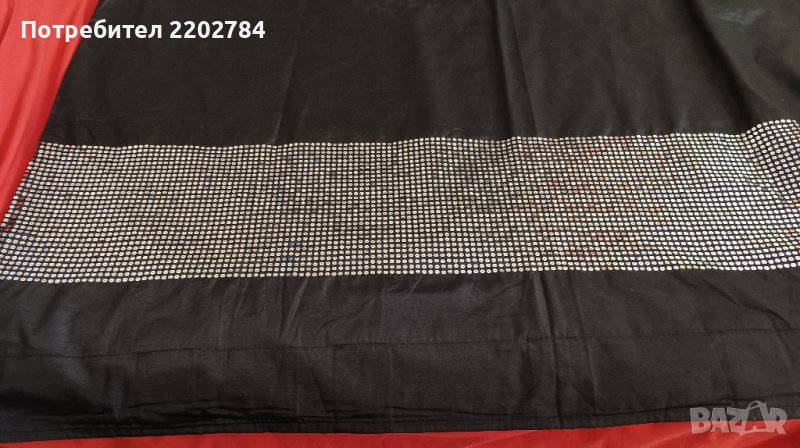 Второто е шикозно перде от. плътен черен сатен с широка ивица пайети в горната част.От задна страна има допълнително бял плат,което прави пердето много плътно.За тръбен корниз,но могат и да се пришият пластмасови копчета за обикновен корниз.
