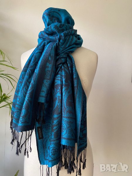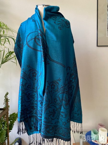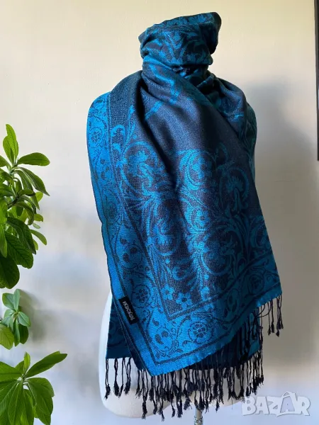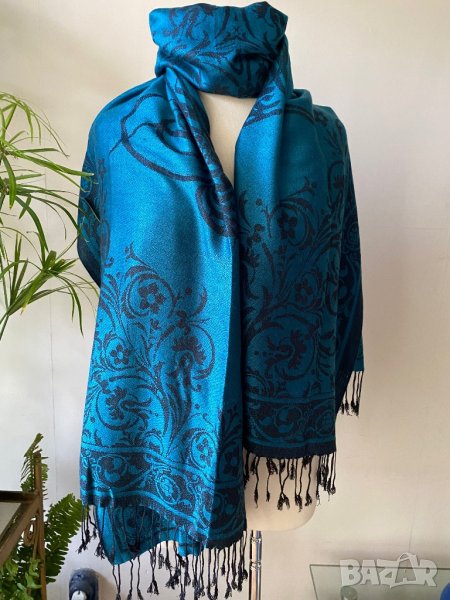 Шал от в маслено зелено и черно, 100 % пашмина, материята е с флорални елементи, с лека лъскавина, размер 190 Х 70 см, мек, топъл и нов. Доставка с Еконт!