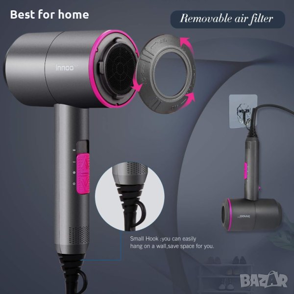 【Гъвкави приставки за концентратор и дифузер】 Сешоарът включва 2 приставки за концентратор и 1 дифузер, които се грижат за различни прически и позволяват гладко ежедневно оформяне или създаване на ясни къдрици. Забележка: За ваша безопасност не блокирайте задния изход за въздух и не поставяйте изхода за въздух с лицето надолу върху масата, когато сешоарът работи, моля, използвайте сешоара при 220V-240V.