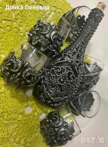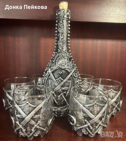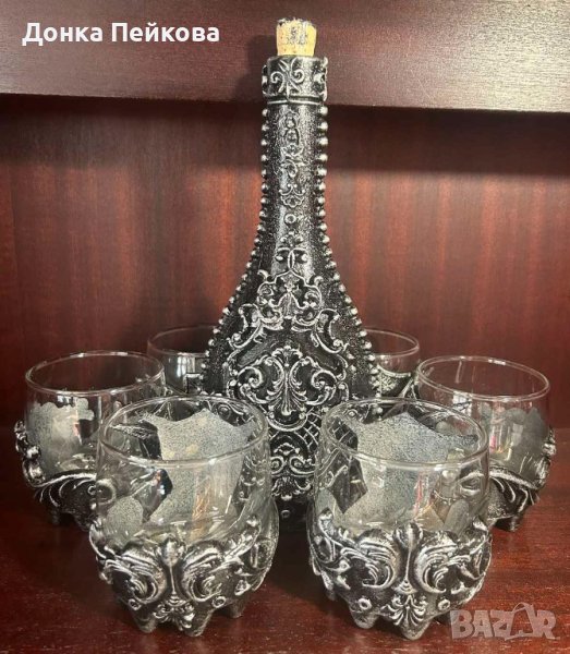 с имитация на старо сребро - един впечатляващ и неповторим подарък за годишнина, за Рожден Ден, за абитуриентска, за сватба, за юбилей, подарък с който гарантирано ще впечатлите всички! Комплекта е единствен и няма да има друг такъв, което го прави уникален. Съдържа бутилка + 6 чаши. За изработката са използвани безвредни и водоустойчиви материали. Може да се мие с мека гъбичка и без накисване. Да не се мие в съдомиялна машина и да не се мие с гореща вода.