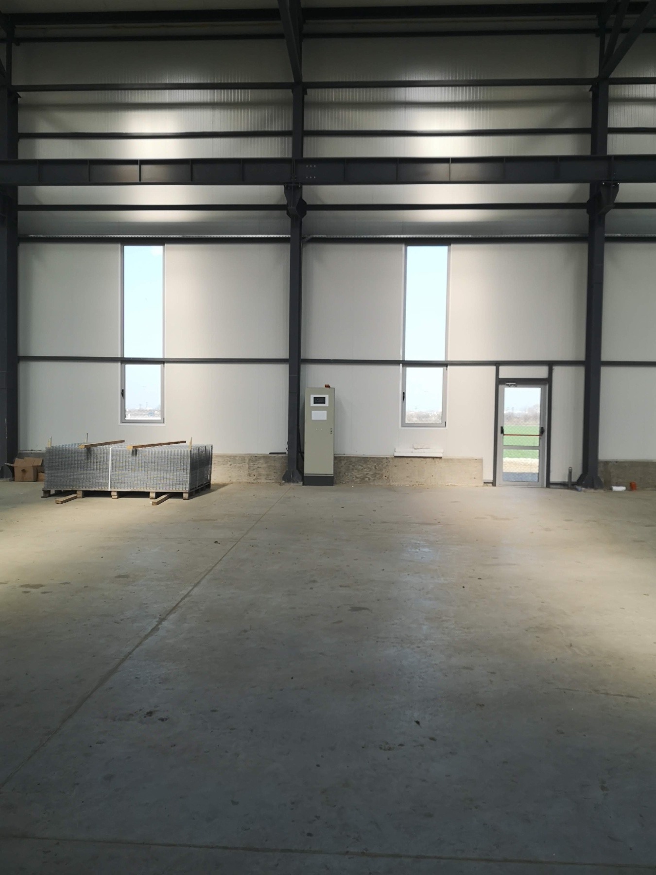 Конструкция - термопанел, под - шлайфан бетон, ТИР достъп с вход и изход, ток - трифазен, височина - 12м, парцел - 6000кв.м.