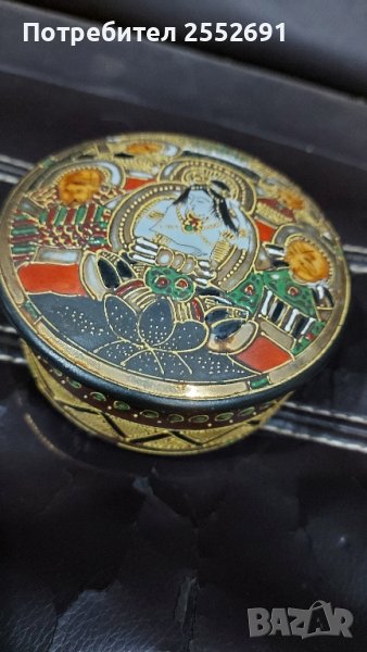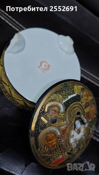 Релефна, ръчно оцветена и изрисувана порцеланова кутия с позлата. Наличие на маркировка. Височина 6,5см. Диаметър- 10,5см.