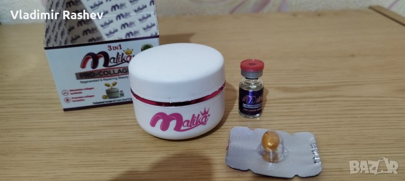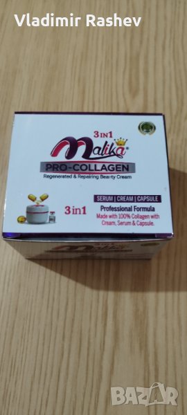 Комплект Малика 3 в 1 - Регенериращ-възстановяващ крем - Изключително богата формула със 100% чист колаген крем, серум и капсула. - Това е перфектната формула за предотвратяване на стареенето и избелване. - Особено полезен е за дехидратирана, чувствителна и зряла кожа. - Стимулира синтеза на колаген. - Намалява бръчките и фините линии. - Насърчава образуването на колаген. - Овлажнява и успокоява кожата. - Прави я сияйна и мека. - Състав: Ретинол и хеалуронова киселина, която минимизира фините линии, бръчките и хидратира добре кожата, като я прави по-плътна, сияйна и осигурява подхранване Съдържание на комплекта - Глутатион серум - витамин Е капсула - нощен крем Малика Пълният курс на прилагане е от 3 стъпки и действа против черни точки,пъпки,бръчки и дехидратирана кожа. Начин на употреба 1.Да се използва всеки ден след почистване на лицето. 2.Поставете няколко капки от серума на чисто лице и масажирайте добре. 3.Счупете капсулата и я смесете с крема. Доставките се извършват чрез Еконт или Спиди в цялата страна, с опция за преглед. Цена на комплекта. 14 лв и 90 стотинки за брой. Куриерската услуга е за сметка на клиента. За количества на едро, предлагаме специални цени и оферти. Моля, разгледайте и другите ни обяви.