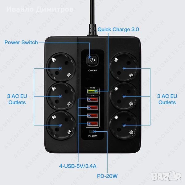 Множество гнезда и портове: Power Socket QC3.0 разполага с 6 стандартни гнезда, които ви позволяват да свържете електрически уреди като компютри, телевизори, лампи и други. Освен това, разклонителят предлага 5 USB порта и 1 Type-C порт, които ви дават възможност да зареждате смартфони, таблети, лаптопи, Bluetooth слушалки и други USB- и Type-C-съвместими устройства.