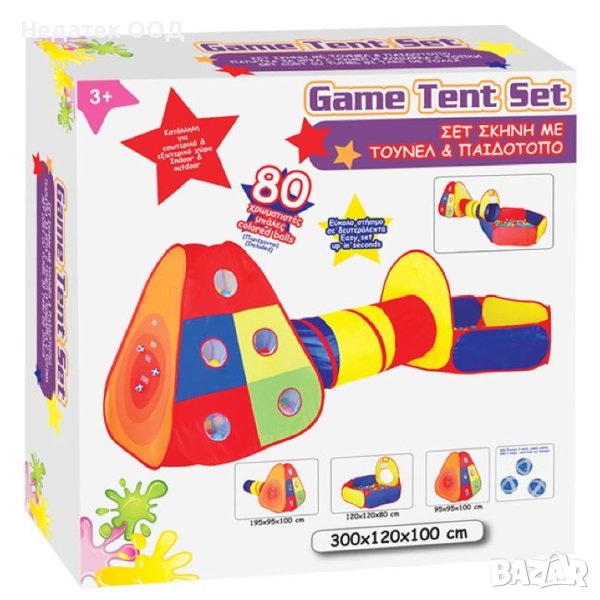 Детска палатка с тунел и малка площадка. Палатката има вход и също е свързана с тунела. Съдържа 80 цветни 6 см топки и 3 обикновени малки топки. Подходящ е за вътрешна и външна употреба и е много лесен за настройка.