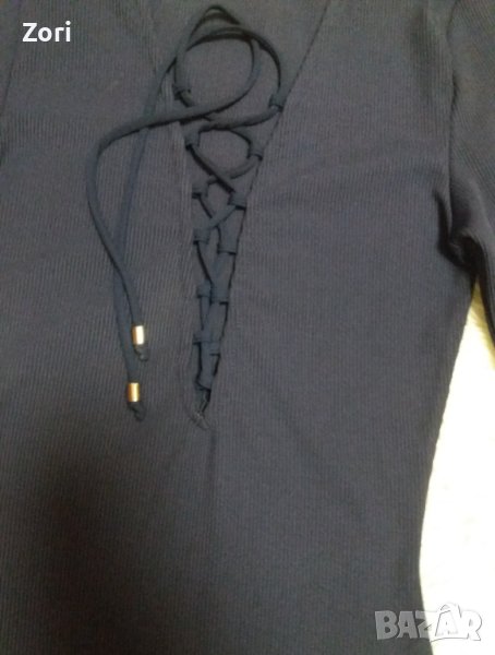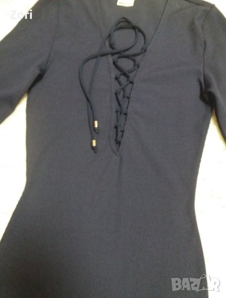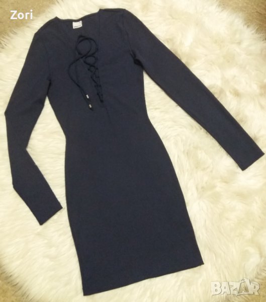 Тъмносиня рокля по тялото с дълбоко деколте с връзки от еластичен плат рипс ХС размер → Обява 43634065