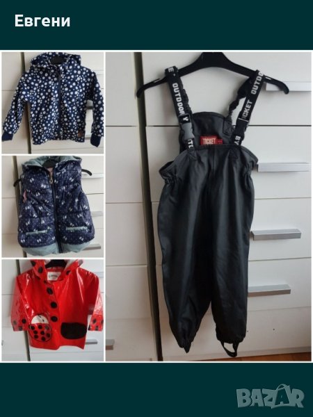 Сн 1 светло синьо яке на Бенетон за момиче на 2 години, цена 15 л, черното яке и синьото с еднородни / 24 мес/, е по 10 лв брой, елек ( 24 мес) - 7 лвСн 2( ветронепропускливо яке (2 - 3 г ), цена 10 лв , елек 7 лв , панталони за туризм 10 лв,/98см/, дъждобран, 5 лв има малка забележка , паднало копче от джоба