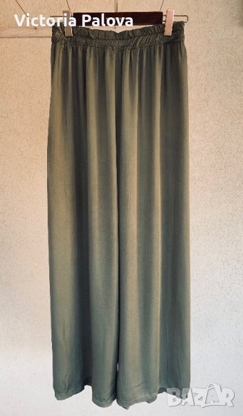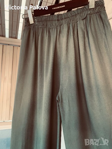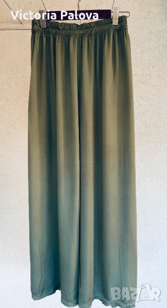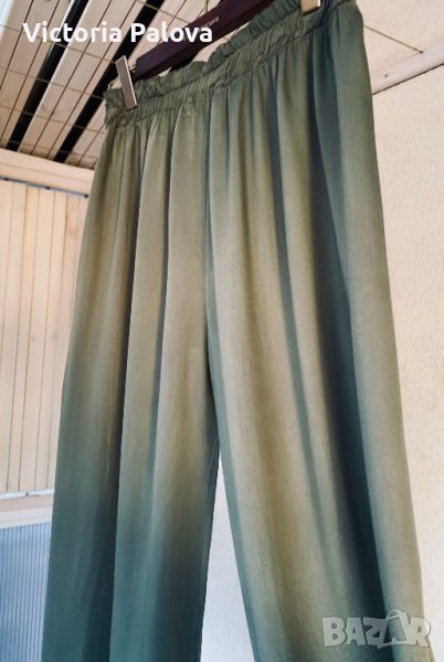 Много красив модерен и удобен панталон, преливаща материя, приглушен цвят olive 🫒 , в талията е с ластик , разтяга се от 38 см до 50см, дължина от колана - 110 см, отвътре - 77 см, крачолът е широк 36 см горе, 33см долу.