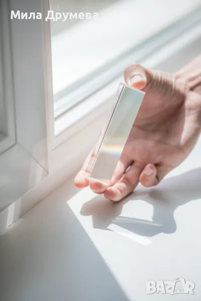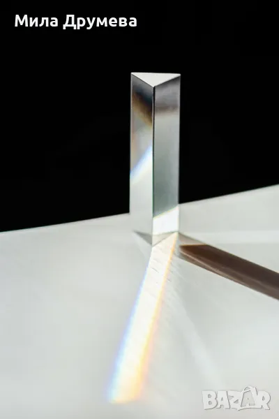 Стъклена призма за разлагане на светлината. Може да се използва във фотографията за добавяне на светлинни ефекти. Големина 10 см на 3см.