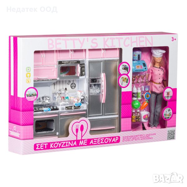 Кухненски комплект със светлини и реалистични звуци, кукла готвач и много аксесоари, храна и инструменти за готвене.Вратите на фурната и кухнята, както и шкафовете се отварят и от кухнята се чуват звуци от работа.Работи с 3 батерии тип AG13 (включени).