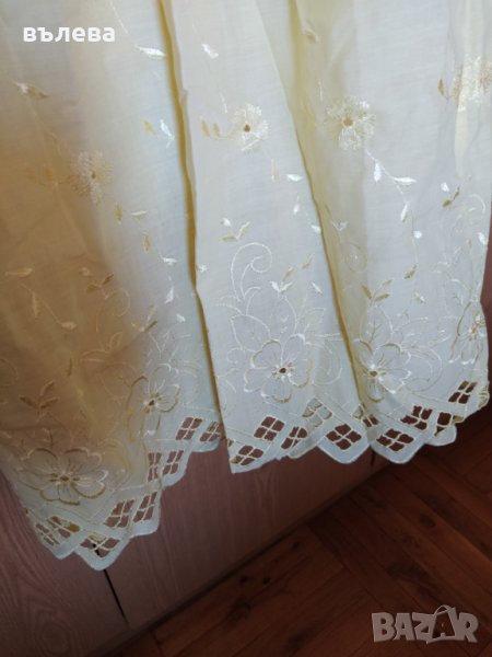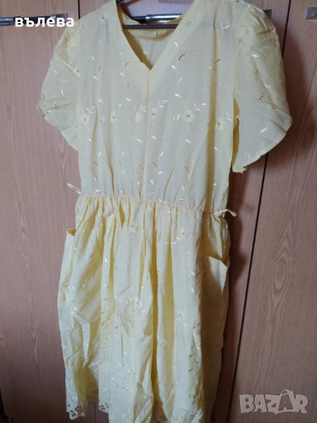 Дамска жълта памучна рокля с английска бродерия, с подплата, с къс ръкав,с дължина под коляното, гръдна обиколка 96см., талия 90 см.