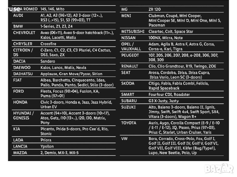 *Списъкът на моделите автомобили не е изчерпателен!