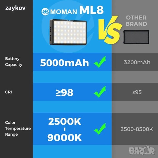 Джобен размер: Светлинният панел на камерата Moman с 96 LED светлини тежи само 5,18 унции, 0,4 инча ултра тънък, позволява ви да го плъзнете удобно в джоба си, както и да го монтирате или закачите за устройства с два слота с 1/4 и 4 отвора за винтове, който може да го ориентира вертикално или хоризонтално.