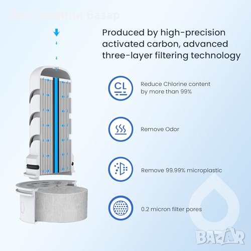 Високоефективна Филтрация: Мощна система за пречистване на водата, улавяща хлор, тежки метали и други замърсители.