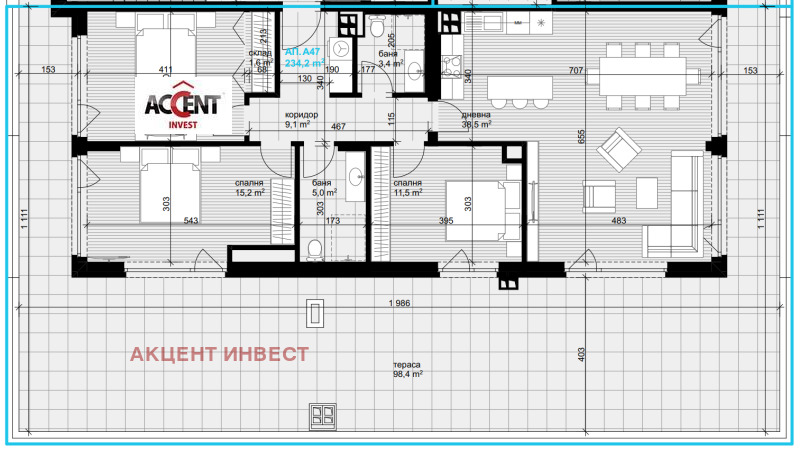 Разпределение: входно антре(коридор)- 8,3 кв.м, просторна и слънчева дневна- 37,7 кв.м., спалня- 15 кв.м., втора спалня- 12,3 кв.м., трета спалня- 13,5кв.м., баня с тоалет- 5,3 кв.м, втора баня с тоалет- 5,9 кв.м. и просторна тераса с площ 99 кв.м с панормен изглед.