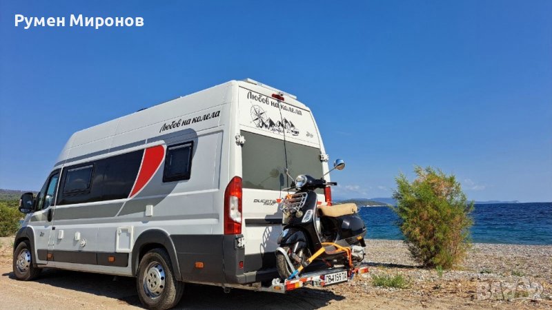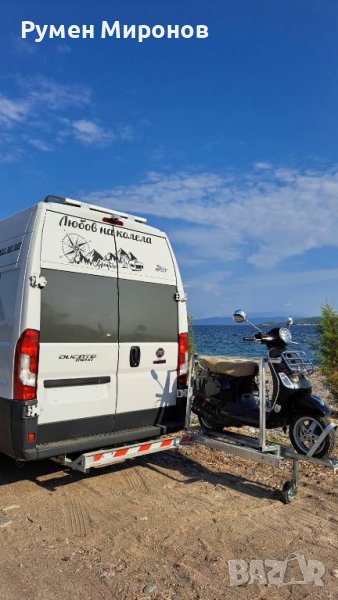 Стойка за скутер, която се отваря на дясно посредством панта, и могат да се отворят задните врати (скутера си остава на стойката).