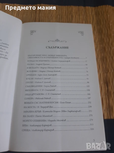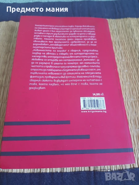 Това пише на задната корица на книгата. Българският Ерос има особена съдба. Поради вековната ни социална несвобода и културна изолация интимният живот дълго е бил недостъпен за публично обсъждане, оставал е скрит зад високите зидове на дома и твърде рядко е попадал в обектива на литературата и изкуството. Нашите писатели дълги години проявяват свенливост към еротичното изображение, за да не разгневяват „непокварената“ общественост и морализаторската критика.