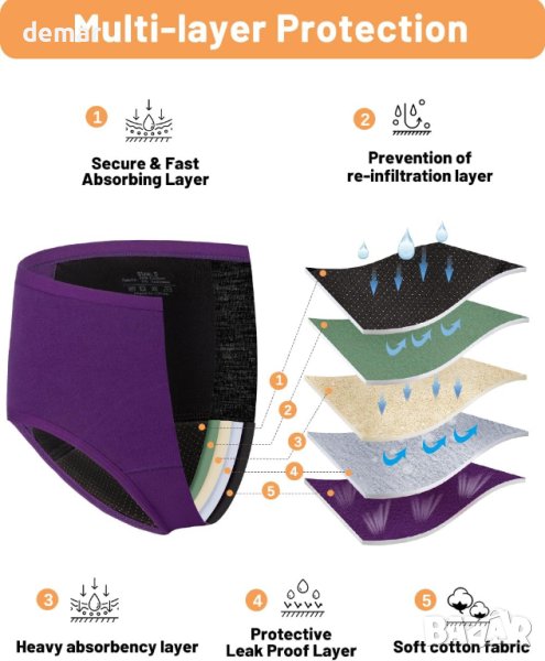Тези панталони за умерен цикъл са надеждно решение за менструални нужди и нужди при лека инконтиненция. Те разполагат с 5-слойна абсорбираща зона, която бързо абсорбира до 30 ml и може да поеме максимум 50 ml, като сигурно заключва влагата. Непропускливият заден слой предлага допълнителна защита, което прави тези панталони отлична резервна част за тампони, чаши или превръзки по време на силно течение. Те също са идеални за леки течове от пикочния мехур, обичайни след раждане или по време на дейности като смях или кашляне. Създадени за удобство, тези панталони имат щадяща кожата конструкция без етикети с покритие отпред и отзад, осигурявайки спокойствие през нощта, особено при леки до умерени течения и нередовен цикъл. Високо изрязаните отвори за краката и еластичната лента на талията осигуряват сигурно, удобно покритие без натиск. Тези панталони, които могат да се перат и използват многократно, са екологични, изработени са от памук и са отличен избор за подарък за майки, баби и приятелки, като предлагат както комфорт, така и устойчивост.
