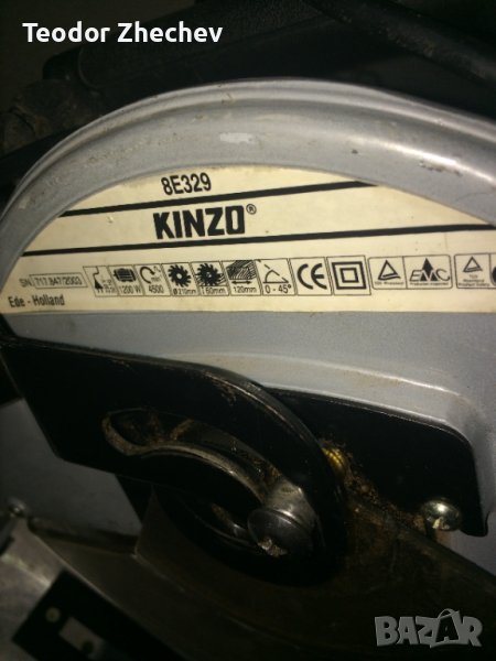 Пендула циркуляр Кinzo 8E329. Производство - старо качествено 2002 г./Holland - вписано и маркирано/. Машината е със запазен външен вид и ОТЛИЧНО техническо и работно състояние без забележки. Мощност на мотора - 1200 W, скорост - 4500 оборота в минута. За дискове размер до ф 210 мм. Машината е с поставен оригинален немски режещ диск за дърво ф 210 мм. Наклон рязане - ъгъл - 0-45 градуса, регулируем. Алуминиев въртящ се долен плот. Регулация на ъгъла на рязане. Тегло на пендулата - призблизително 8 кг.