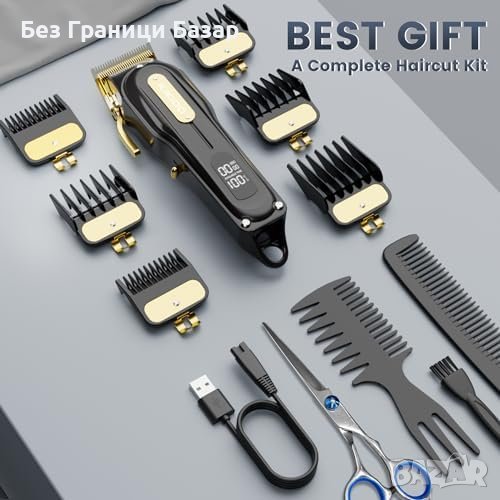 Комплект за Подстригване: Включва 6 гребена, кърпа, четка за почистване, ножици, USB кабел и гребен за фризьор.