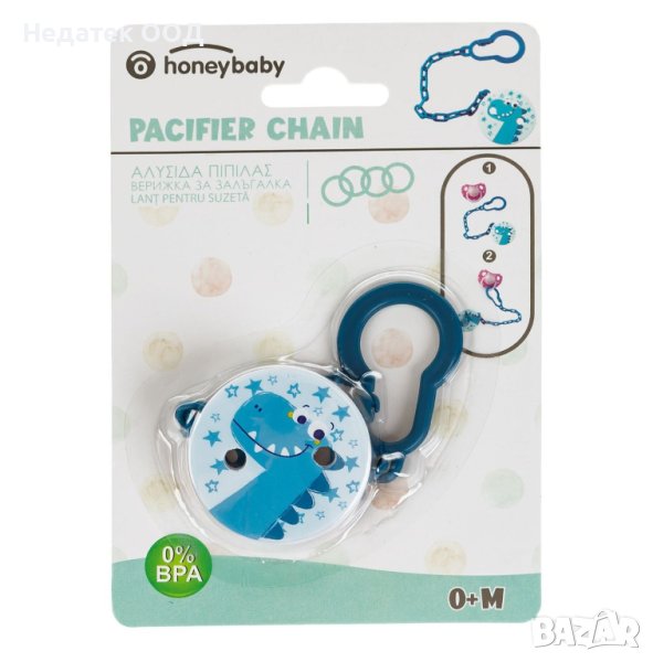 Малка и лека верижка за залъгалка (0% BPA) в син цвят с дизайн на динозавър.Използването на веригата е хигиеничен и ефективен начин да предотвратите падането на залъгалката на пода.Подхожда на повечето дрехи.
