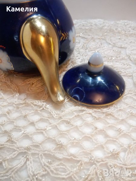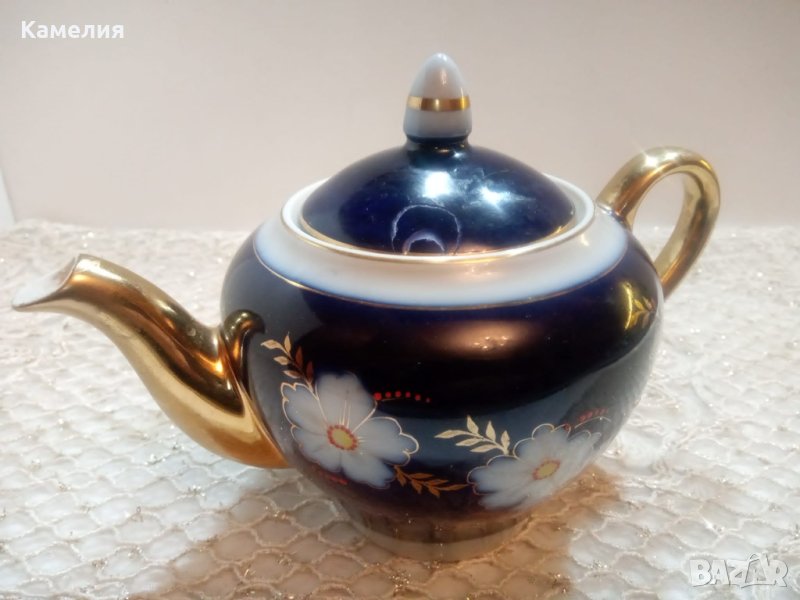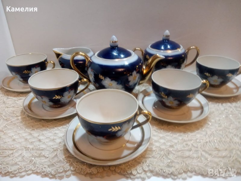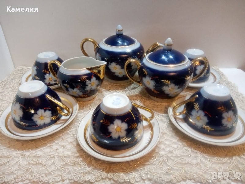 Сервиз за чай Ябълков цвят. Довбъшски, 50-е години. Кобалт, злато. Автор на роспис Полищук. Чайник, захарница, латиера, 5 чаши за чай 220 мл, 5 чинийки. Печати са от различни годините. Витринен е. Забележки: малка по чучура на чайник, мисля че фабрична и на капачка ( последна снимка).