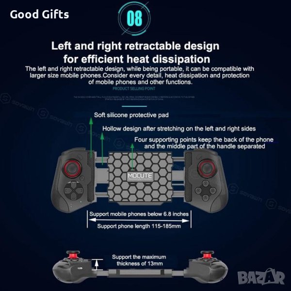 Геймпадът е съвместим с различни мобилни игри, включително популярните Dungeon Hunter и Shadowgun, както и други подобни заглавия. Той поддържа различни устройства, включително Android телефони и iPhone, за да може всеки да се наслади на предимствата на невероятен гейминг.