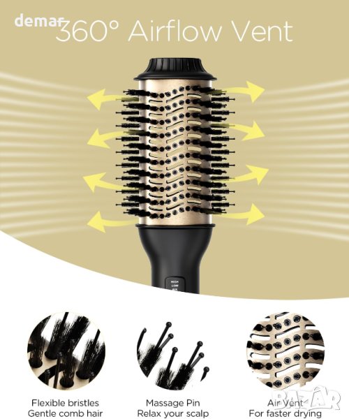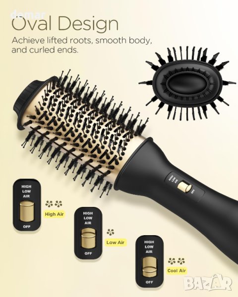 Тази професионална четка за изсушаване на коса разполага с уникална керамична титанова технология и излъчва 100 милиона отрицателни йони, намалявайки къдренето с 30% и насърчавайки по-бързото изсушаване. Задържа влагата в корените за по-блестящ и по-здрав стил, като същевременно минимизира щетите и равномерно разпределя топлината, за да насърчи растежа на косата. Дизайнът "всичко в едно" ви позволява да създавате къдрици, да изглаждате къдриците и да увеличавате обема, предлагайки ефективно издухване с качество на салона. Неговата ексклузивна овална форма с 360° въздушен поток, заоблени ръбове, найлонов щифт и туфтинг влакна подобряват обема, оформянето и контрола. Четката предлага и 3 настройки за топлина/скорост, които се грижат за всички типове коса за по-бързо изсушаване и гъвкаво оформяне.