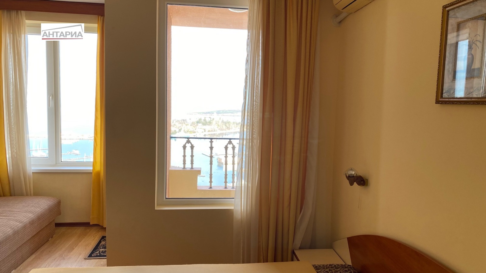 Обзаведен двустаен апартамент в централната градска част с изглед към пристанището. Апартаментът е на трети етаж, разпределен в коридор, дневна с кухненски бокс, спалня, две бани с тоалетна и два балкона. Апартаментът е подходящ за отданае под наем като два отделни имота.