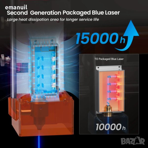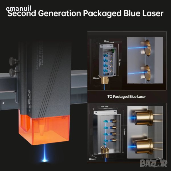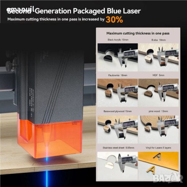 СИН-BLUE 450nm подходящ за рязане/гравиране всякаква дървесина,гравиране черна и неръждаема стомана,рязане/гравиране кожа,гравиране естествен-изкуствен камък и техни разновидности,рязане на всякакви пластмаси и гравиране предимно на двуцветни,гравиране на прозрачно стъкло с потъмняване или със специално цветно фолио за не метални повърхности и др.