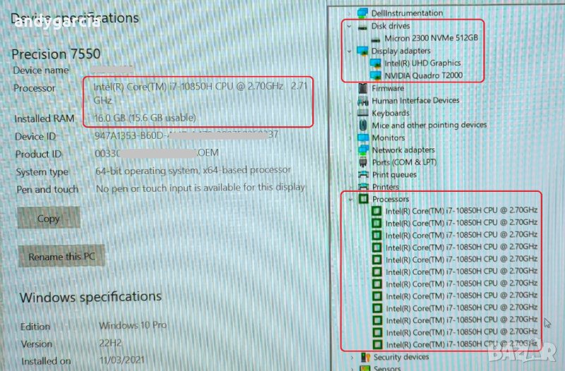 Продава се лаптоп без забележки, оригиналното 180 вата зарядно и вграден лиценз за Windows 10/11 Pro.