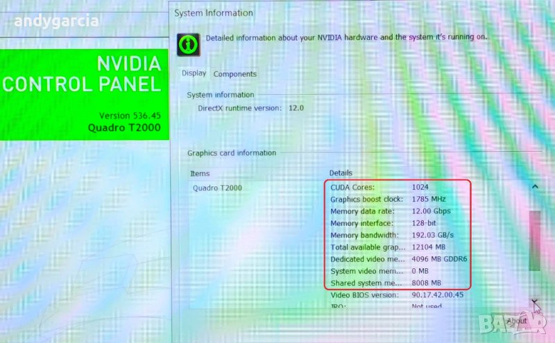Картата е NVidia Quadro T2000 4GB 128bit. 1024 Cuda Cores - видеото е на слот.