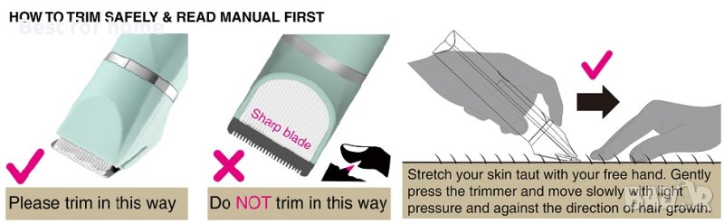 【ТОПЛИ СЪВЕТИ ЗА ПОДСТРИГВАНЕ】: Изпънете кожата си със свободната си ръка. Внимателно натиснете тримера и го движете бавно с лек натиск и срещу посоката на растеж на косъма. Внимавайте за посоката на острието, моля, проверете снимка 8, за да разберете как да подстригвате безопасно.