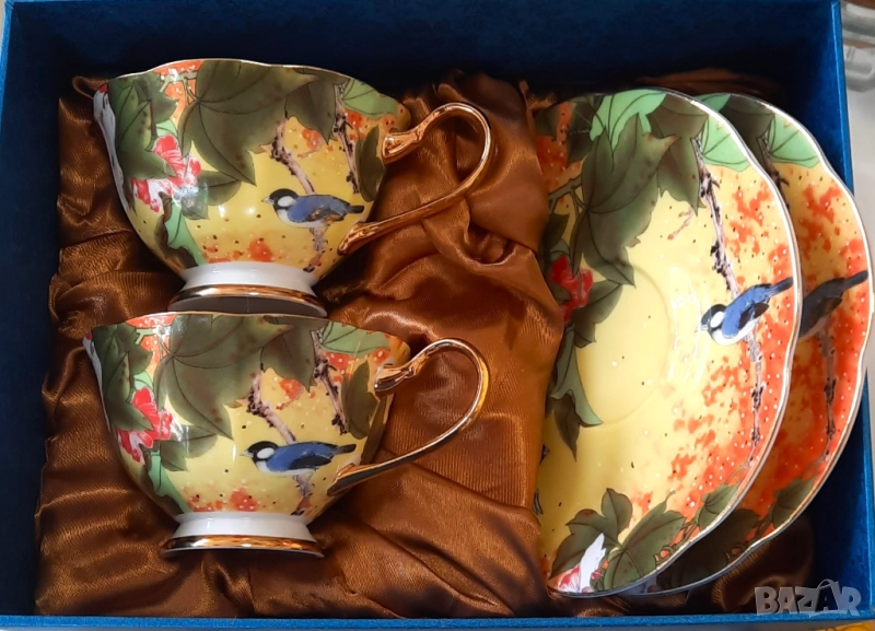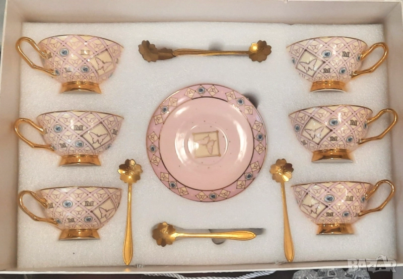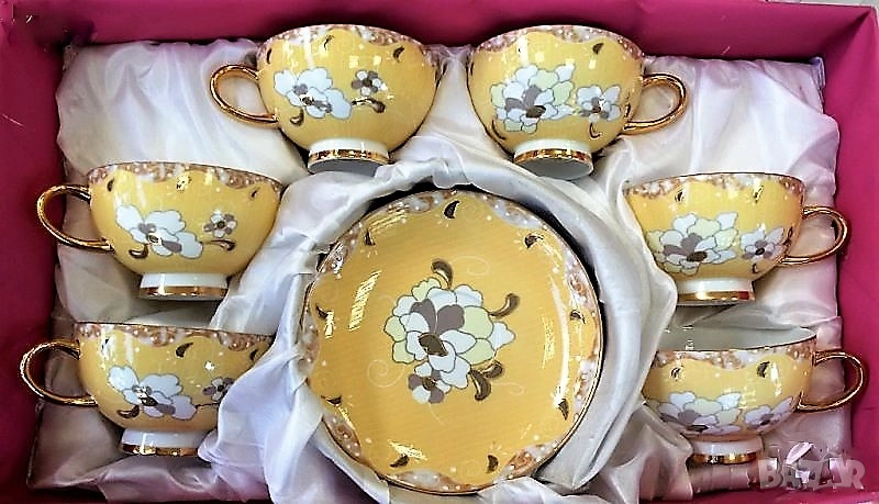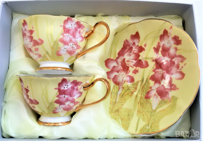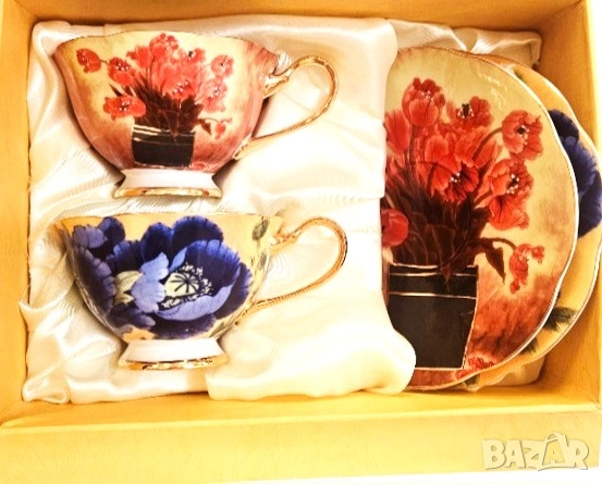 Чаши -180 мл. изработени от висококачествен, фин костен порцелан с флорален декор, включително и вътрешната част на чашите. В допълнение златна дръжка, златно столче и златен кант в съчетание с лъжички към всяка чаша за завършен вид.