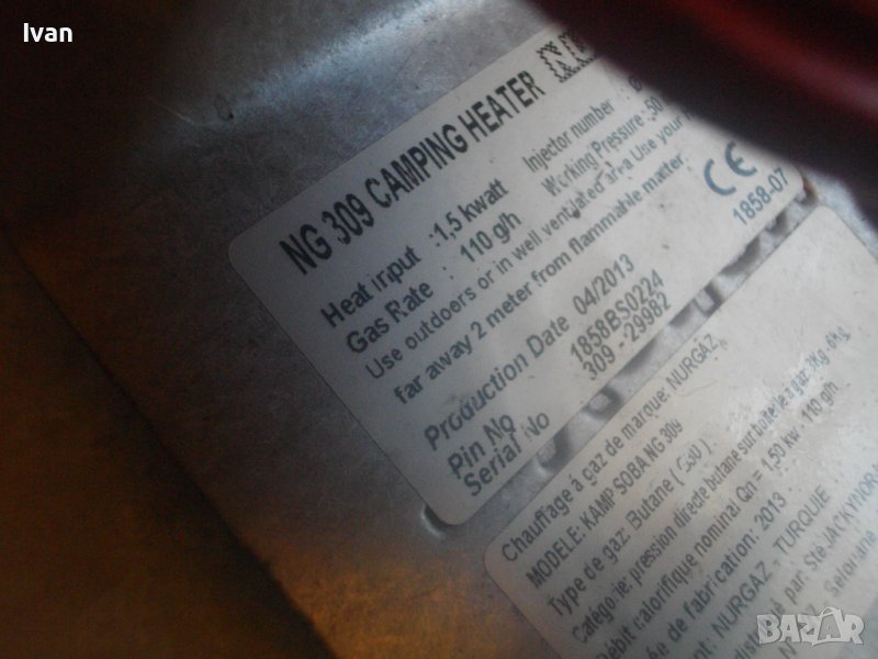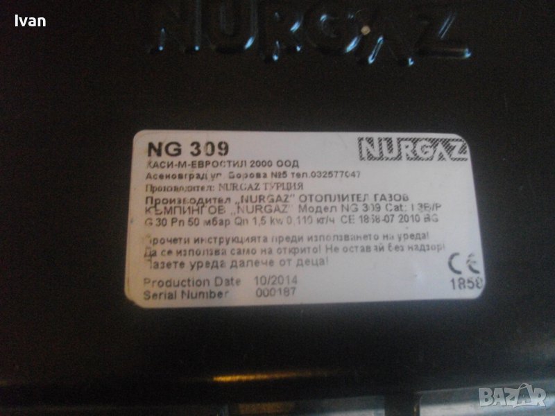 ОПИСАНИЕ на газов пропан-бутан къмпингов керамичен отоплител. Цена 99 лв. Малко ползван, почти нов, като нов. Труско производство - 2014 г - NURGAZ NG 309. Размери на питата - 185 х 145 мм. Отлично състояние. До 50 mbar - 1,5 kg h. Поставен редуцир вентил оригиинален - 2013 г - турски - червен - NURGAZ TS 1882 Regulator Butan - Propan - 110 kg h - 50 mbar. Характеристики на отоплителя - ф 0,53 мм - 1,5 KWatt.