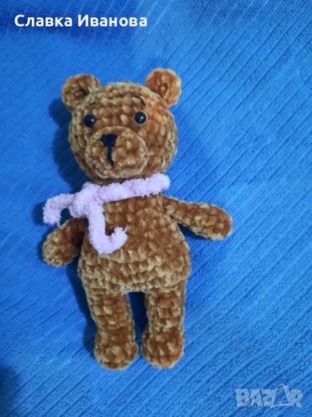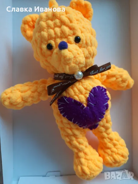 10. Жълто мече. Изработено от мека хипоалергенна прежда. Поставени обезопасени очички и носле, с пълнеж от силиконов пух. Цена: 27