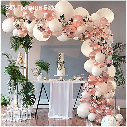 Разнообразие от цветове и размери: 15 бр. розовозлатни конфети балони (12 инча), 37 бр. матови бели балони (10 и 18 инча), 20 бр. прозрачни балони (5 инча), 35 бр. розовозлатни балони (5 и 10 инча).