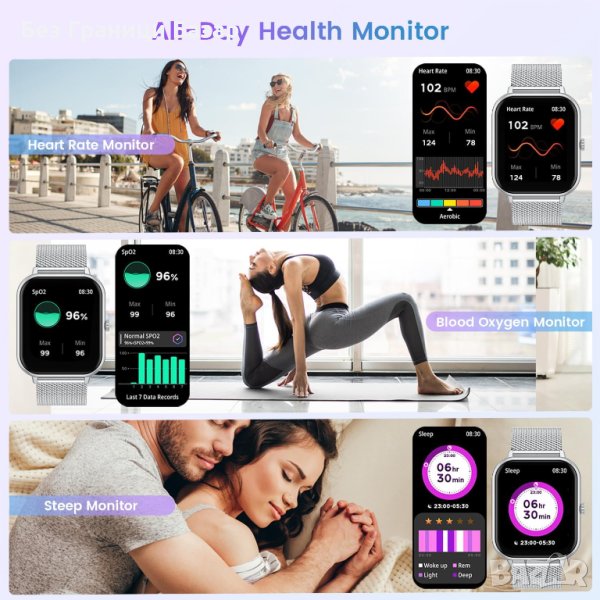 - Здравен монитор за жени: 24-часово следене на сърдечния ритъм, кислород в кръвта, управление на менструален цикъл и сън.