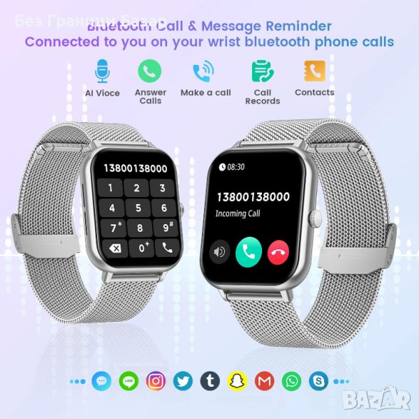 - Bluetooth обаждания и известия: Поддържа Bluetooth 5.1, позволява приемане, извършване и отхвърляне на обаждания. Съобщения от социални мрежи и гласов асистент.