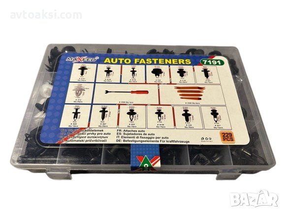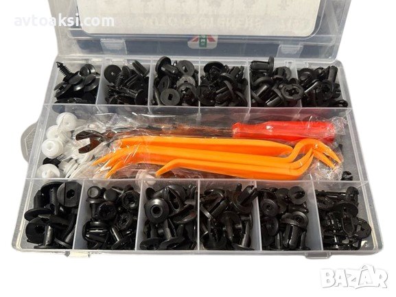 Комплектът има 13 вида фиксатори и държачи за калник и броня.