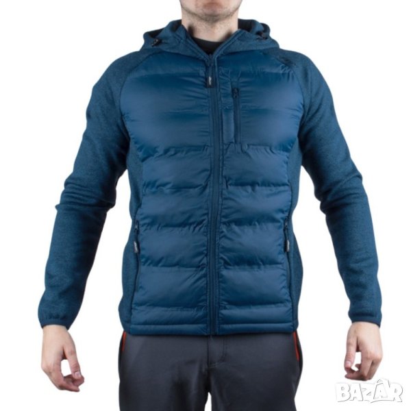 Хибридно яке направено от две допълващи се материи, които му придават индивидуалност. Има регулируема с връзки качулка, два странични джоба и един на гърдите. Маншетите са еластични за по-голямо удобство.
