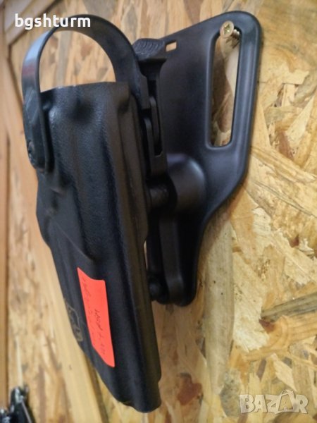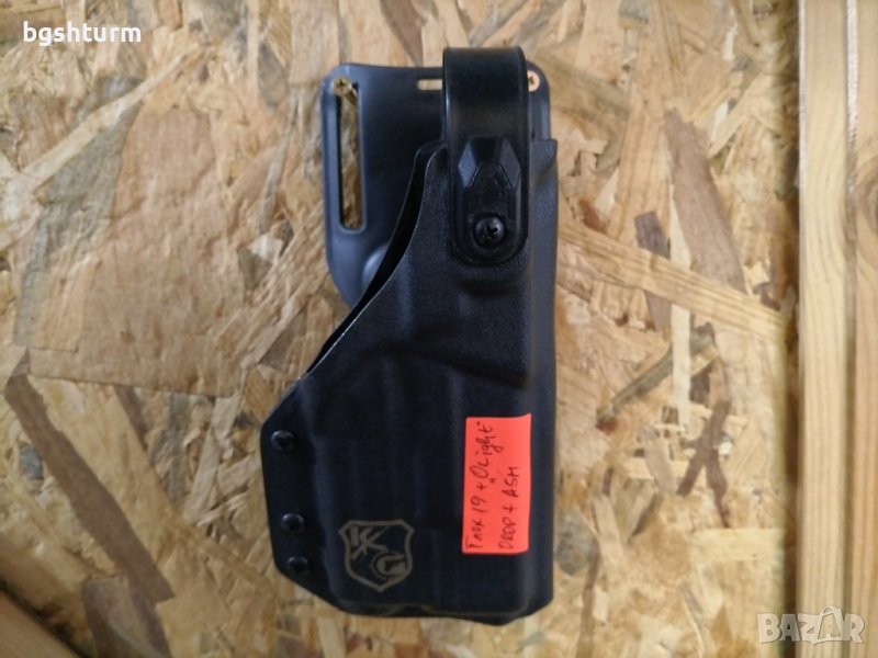 КОБУР КАЙДЕКС ЗА ПИСТОЛЕТ ГЛОК19 С ФЕНЕР ''OLIGHT'' И СИСТЕМА ''DROP/ ASM'' . Много удобен , здрав и надежден , изработен от твърда пласмаса по технология '' кайдекс'' . Автоматичен обезопасяващ бутонSLS (ASM) с капак , който само с едно досване на палеца в посока основата се отваря и позволява бърза манипулация с оръжието .