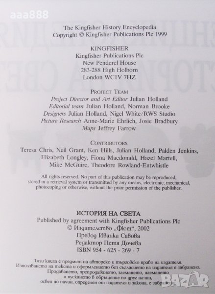 Енциклопедия История на света, издателство ”Фют” с разрешението на Kingfisher Publications Plc, London, 2002, луксозно издание, твърди корици, 520 стр., размер 28 х 22 х 3 см, тегло 1.780 кг. Книгата обхваща 40 хил.години от историята на света и е обогатена с повече от 2 000 цветни илюстрации, фотографии, карти, хронологични таблици и справочник. Нова, неразлиствана, без забележки.