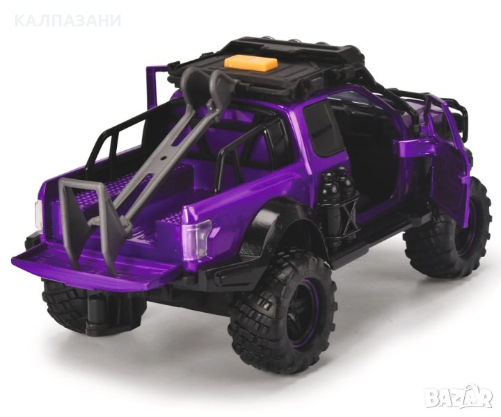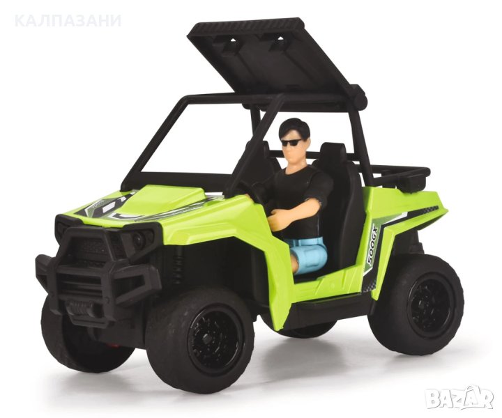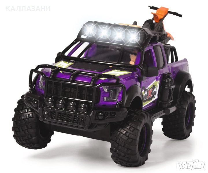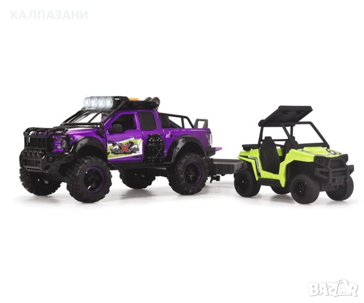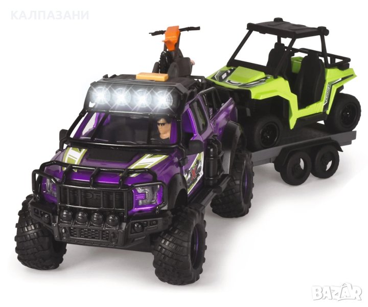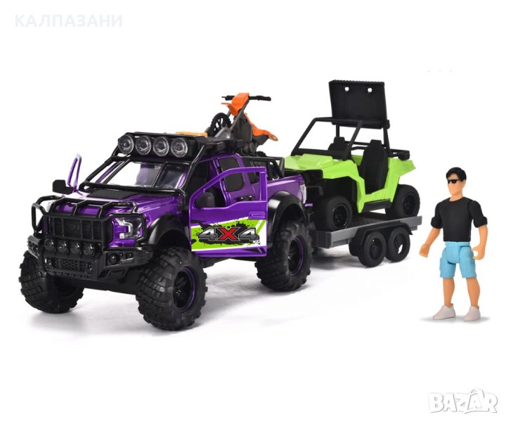 Пригответе се за вълнуващи приключения на открито с комплекта Dickie Toys County Trail! Този комплект приключенски играчки от Dickie Toys е перфектната играчка за любителите на офроуд екшъна. Карайте дълбоко в гората или нагоре по високи планини и изживейте вълнуващи приключения! Разполагащ с носач за мотоциклет, ремарке, с мотор и екшън фигурка с подвижни стави, Ford Raptor има всичко, от което се нуждаете за следващото ви офроуд приключение. Покривът на превозното средство има вграден модул, който произвежда реалистични светлинни и звукови ефекти. Когато натиснете бутона, модулът възпроизвежда звук от природата и двигателя и включва фаровете на покрива. Голямата играчка с висока проходимост и ремаркето с UTV са дълги общо 38 см и разполагат с набор от движещи се части. Благодарение на вратите, които могат да се отварят и затварят, фигурката може да бъде поставена зад волана на Ford Raptor. Комплектът Country Trail в мащаб 1:24 е подходящ за деца на възраст 3 и повече години и се предлага с батерии.