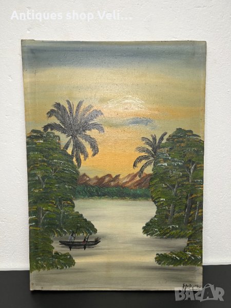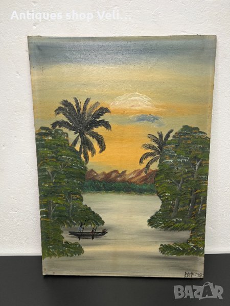Афтиканска авторска картина от република Конго. Подписана от автрора-J. Dipumbu. Изработена през 50-те години на 20в. Рисувана върху платно, поставена в масивна рамка от махагон. В много добро състояние.Предлагаме доставка с Еконт и лично предаване за градовете Велико Търново и Сливен