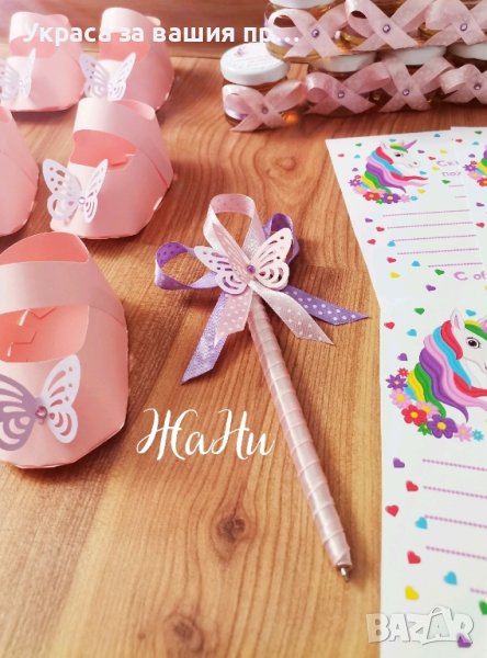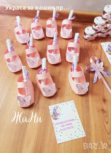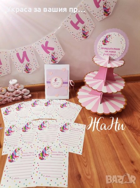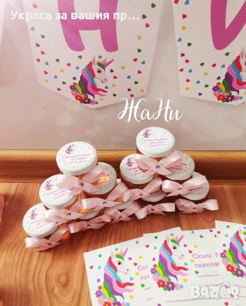 Украса За прощъпулник на тема Еднорог* надпис*стойка за мъфини и сладки* месал за питката* карти за пожелания от гостите в папка и украсен химикал * бурканче с мед подаръчета за гостите* 3д пантофки подаръчета за гостите /покани